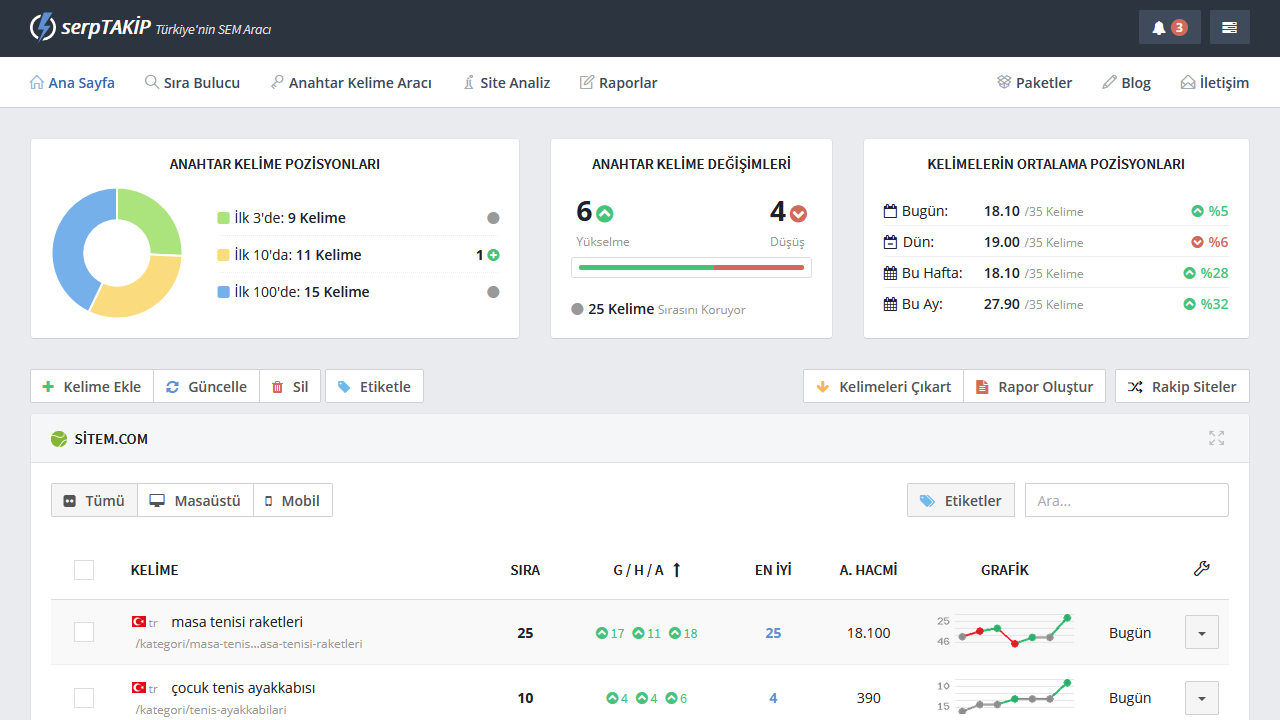 Siteniz anahtar kelimelerini Google'da otomatik takip altına alın. Bununla birlikte rakiplerinizin de bu kelimelerdeki durumunu öğrenin.